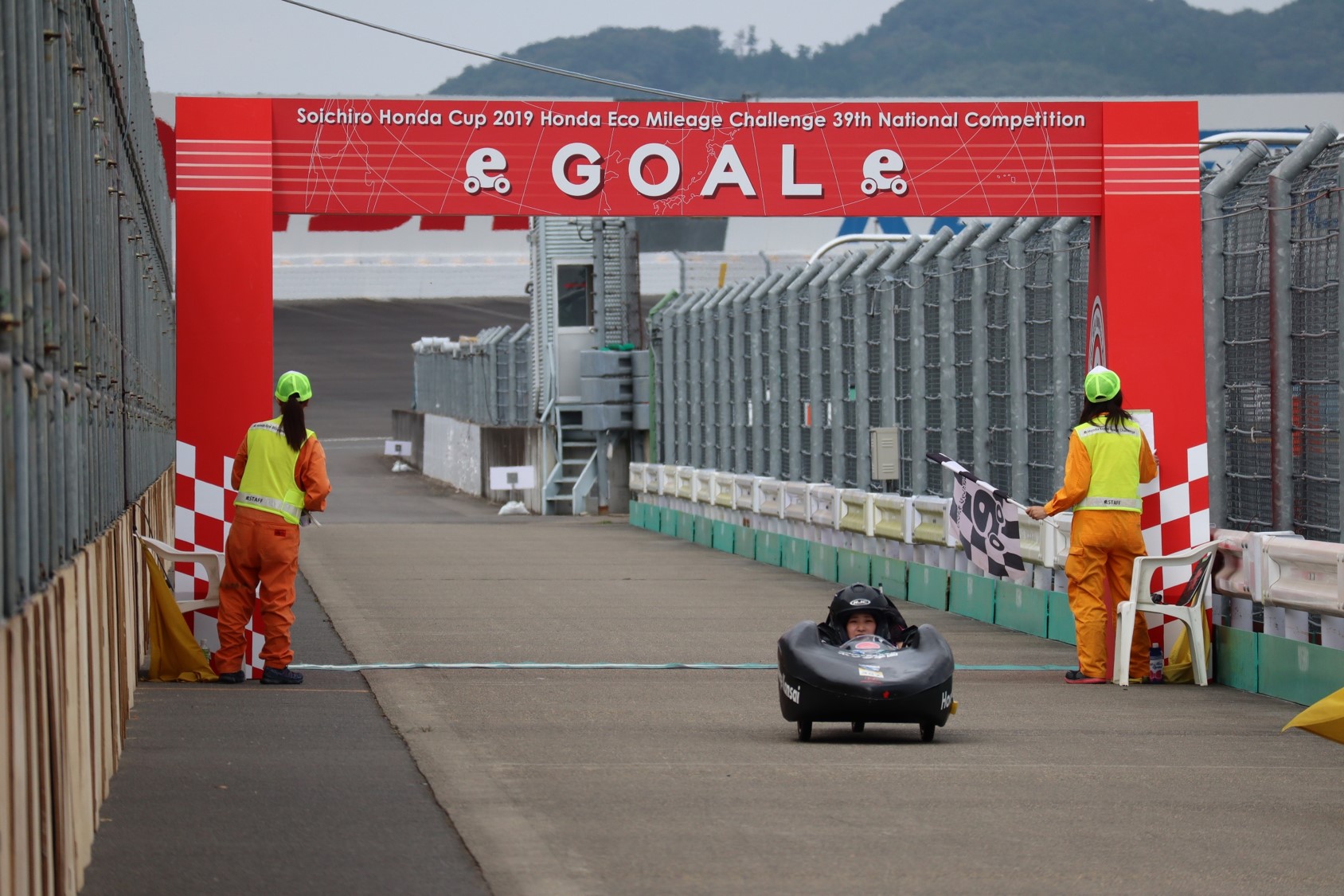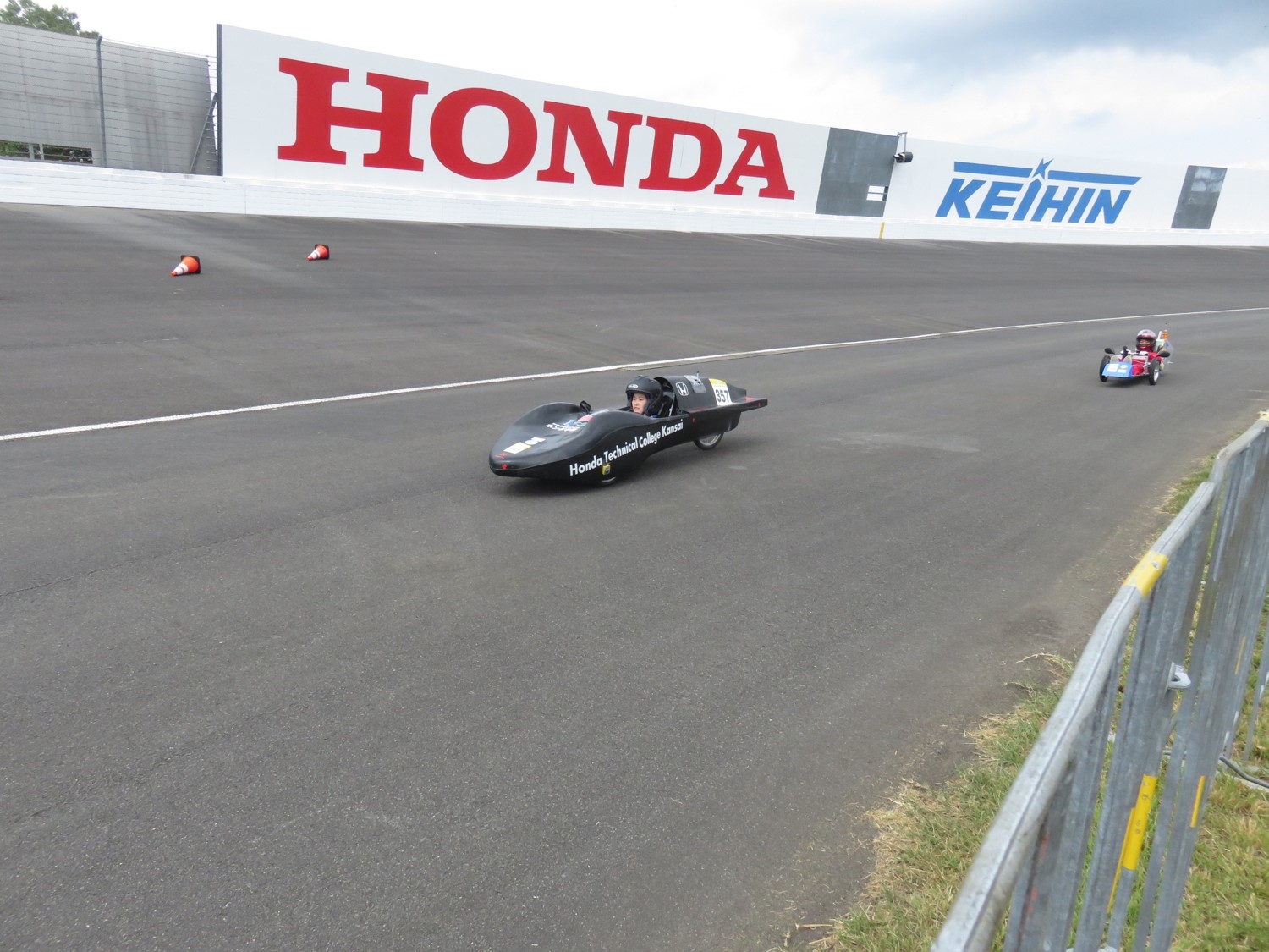 学生たちが一丸となって取り組んだ結果、無事に車検を通過し、レース本番も順調にスタートを切りましたが、今度はドライブチェーンが外れるトラブルに見舞われ、ドライバーがコース上で修復する事態となりました。修復し、再スタートを切るものの、規定時間内にゴール出来ず、タイムオーバー。
