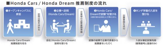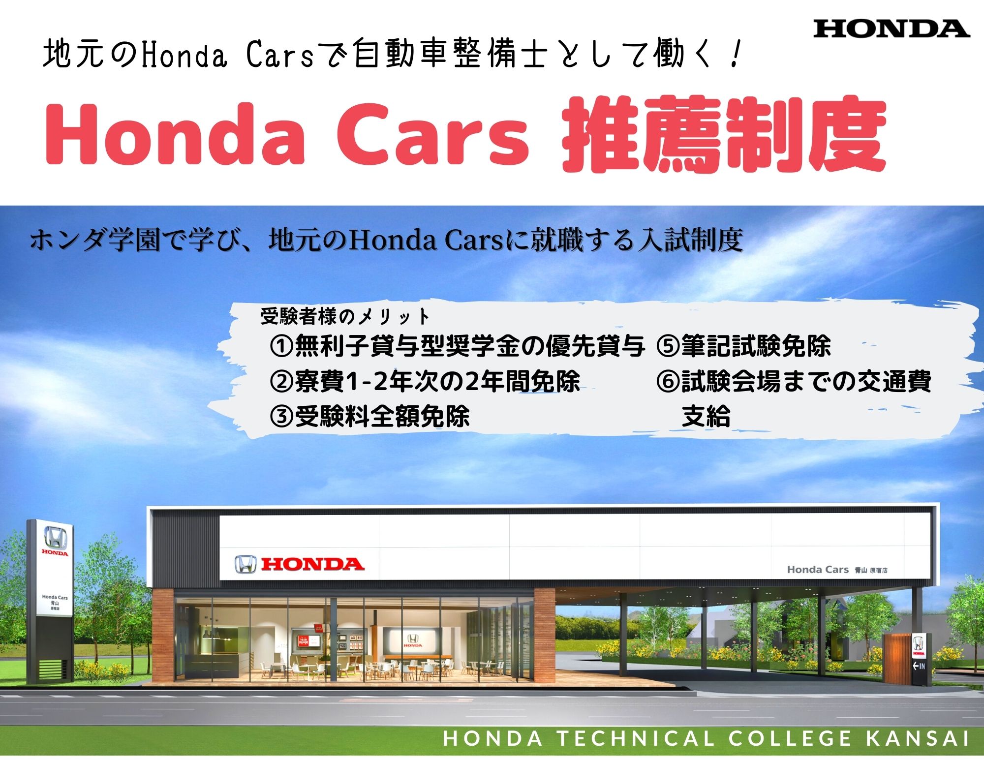 ホンダ学園の入試を受ける際、Honda Cars(ホンダ学園卒業後に就職する企業様)の代表者様から推薦をもらい、ホンダ学園に進学・卒業後(国家整備士資格を取得)、学園入試時にご推薦していただいたHonda Carsに就職する制度です。