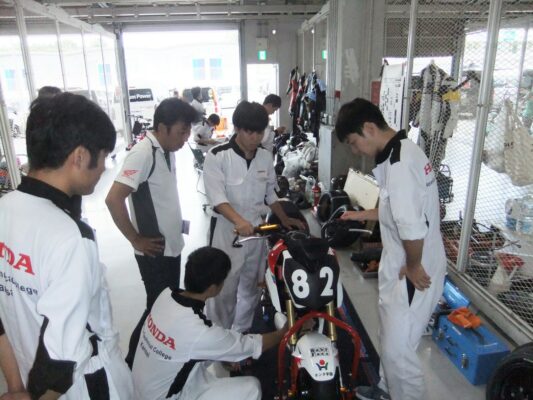 そして迎えた決勝レースでは、学生がサイン、メカニック、燃料補給、ライダーとして、それぞれの役割を責任を持ってこなし、順調に周回を重ねますが、スタートから40分過ぎに2コーナーで転倒。幸いライダーに怪我は無く、ピットまで戻ると、メカニックがマシンを懸命に修復し、コースに戻すことが出来ました。