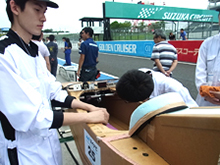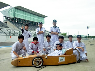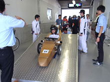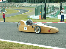 今年のメンバーは、車体の軽量化に取り組み、ボディを「Pパネル」というダンボール素材で製作し、従来に比べて11Kg軽量化を実現しました。また、フロントタイヤを転がりの良い小型サイズに変更し、「今年こそ完走」を目標に臨みました。1、2周は順調に走行し、いよいよ最終の3周目。鬼門のダンロップ坂も無事越えて、完走に期待が高まりましたが、残念ながらスプーンカーブの先で電池切れとなりストップ。参加83チーム中34位の結果に終わりました。しかし、車体の軽量化に取り組んだ事が評価されて「技術賞」を頂きました。ゴールまで残り1.8kmの悔しさをバネに「来年は必ず完走するぞ!」
