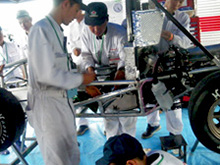 - 自動車研究開発科2年生は、9月2日(火)~6日(土)、静岡県エコパで開催された全日本学生フォーミュラ大会に参加しました。この大会はもの作りを学ぶ一環として、1年次からマシンのコンセプト企画に始まり、モックアップレイアウト製作、先生による評価会を経て、マシン製作、テストを繰り返し、夏休み返上で準備して臨みました。チームの特徴はアルミフレームの採用により「最軽量マシン」を目指し、大会では「スキッドパッド 1位」を目標に臨みました。