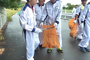 この日もリーダーの指示のもと、10名単位のグループに分かれて分担エリアを決め、学生寮近辺の国道沿いの歩道や住宅街の側溝、近隣の公園等を約1時間かけて掃除をしました。特に目立ったのが国道沿いの「ペットボトル」や「吸殻」のゴミです。クルマや歩きながらの「ポイ捨て」が原因と思われますが、学生はゴミを拾いながら「マナーの重要性」も考えながら作業を行っていました。