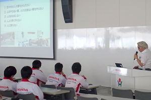 この日の講話は、ホンダが商品の開発から工場での生産、各販売会社、そして最終的にはリサイクル工場までと全ての企業活動を通して環境問題に取り組んでいる事を紹介して頂き、明日からの自動車構造を学ぶ点でも参考にさる事が多々あった様子でした。