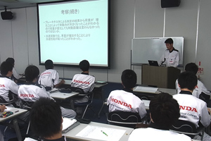 この授業は、学生自らが課題テーマを決めて、自分達で解決手法を検討し実践する事で「考動力」を身に付ける事を目的に実施しています。各グループは、テーマに沿って実習場や教室・校庭を使って様々な実験・検証にチャレンジしました。校庭に水を撒いたり、重量物の変化による制動力の調査や、コーティング剤の調査、カーエアコンに関する検証等々工夫を凝らしながら取り組んでいました。