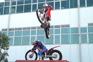 白熱したバトルが繰りひろげられた「オリジナルヒーローショー」は子供達に大人気となり、「JAF(一般社団法人・日本自動車連盟)による安全運転」では模擬衝突体験や子供運転免許証発行も行われました。一番人気を博したのは世界レベルのライダーによる「トライアルバイクショー」で様々なアクロバティックな技が披露され、拍手喝采の大盛り上がりとなりました。