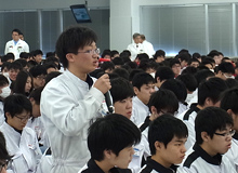 最後に学生から「学生時代に熱中していた事は?」「リーダーとして大切な事は?」といった就職活動を視野に入れた質問から、「今年はF1に勝てますか?」「ワクワクするバイクを出して下さい!」等、社長も思わず苦笑いをする質問も飛び出しましたが、最後まで丁寧に応えて頂き、学生は八郷社長から元気を一杯もらった講話となりました。