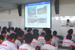 - 9月23日(金)、社会人としての一般的な環境問題の知識取得とリサイクルの必要性、ホンダのリサイクルへの取り組みを通じて自動車業界で必要とされる環境意識を学ぶ為に、本田技研工業(株)環境推進センターから牧様・川崎様・倉光様・山根様をお招きして「環境・リサイクル講話」を開催しました。