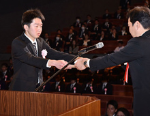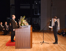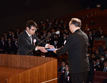 式は「卒業証書」授与に引き続き、在学中の成果に対しての各種表彰・認定証の授与が行われました。また、ご出席いただいたご来賓を代表して、大阪狭山市長 古川 照人様から卒業生への励ましのご祝辞を頂き、式の最後は卒業生を代表して、自動車整備科 泉 光希君が、いままでの感謝とこれからの社会人としての夢と誓いを「答辞」として述べて締めくくりました。