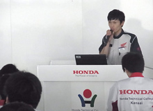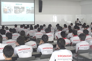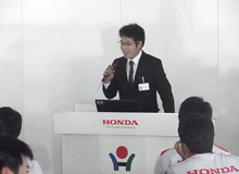 この日は四輪販売会社を代表して㈱ホンダカーズ大阪の関川様、二輪販売会社からは㈱ホンダドリーム近畿の大前様、製造開発分野からは武蔵精密工業㈱の岡田様と若手の方にお越しいただき、より学生視点に近い講話をして頂きました。