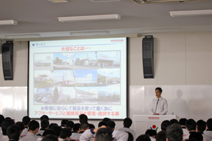 今年は「全ての接点でお客様満足度No1を目指して」というタイトルで、お客様の期待を超えるサービスを提供する取り組み実績や、将来へ向けての新技術の方向性を動画を交えながらお話しして頂きました。講話終了後は、学生から活発な質問も出て、大変有意義なセミナーとなりました。