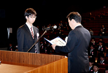 式は「卒業証書」授与に引き続き、在学中の様々な取り組みの成果に対しての各種表彰・認定証の授与が行われました。また、ご出席頂いたご来賓を代表して、近畿運輸局大阪運輸支局 次長 柳井 達雄 様と、社団法人大阪府自動車整備振興会 常務理事 原 一雄 様から卒業生に励ましのご祝辞を頂き、式の最後には卒業生を代表して、自動車整備科 杉峰 正悟 君が、いままでの感謝とこれからの社会人としての夢を「答辞」として述べて締めくくりました。