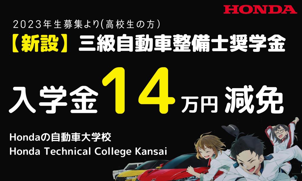 2023年入学生より、新たに給付型の「三級自動車整備士奨学金」を新設いたします。全国にある三級自動車整備士の資格が取得することができる高等学校に通っている高校生の皆様、ぜひ、国家資格「三級自動車整備士」を取得して、ホンダ学園へのご入学をご検討ください。今回新設する「三級自動車整備士奨学金」は2023年4月入学生より適用となります。