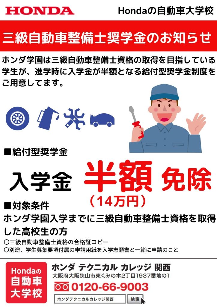 対象:ホンダテクニカルカレッジ関西入学までに三級自動車整備士資格を取得している高校生 ※既卒・留学生対象外