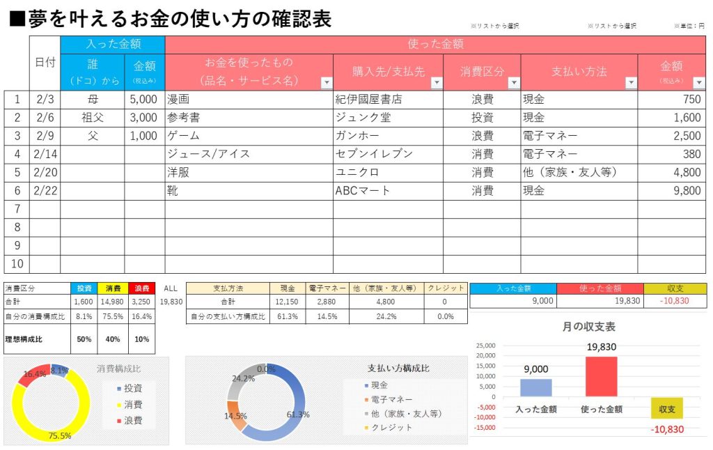 ■夢を叶えるお金の使い方授業の受講者様にはオリジナルの「夢を叶えるお金の管理表(エクセル)」無償提供