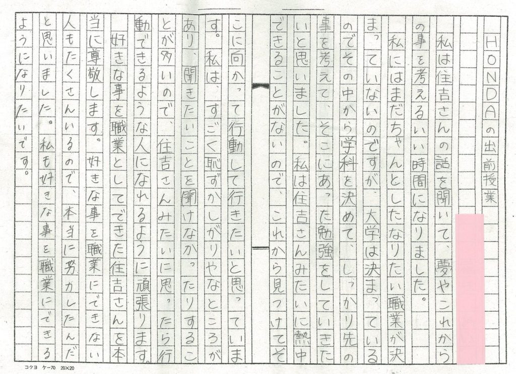 →受講された生徒様の感想文いただきました。生徒それぞれの思いや感想・決意にとても感心しました。この度は講話の開催、誠にありがとうございました。