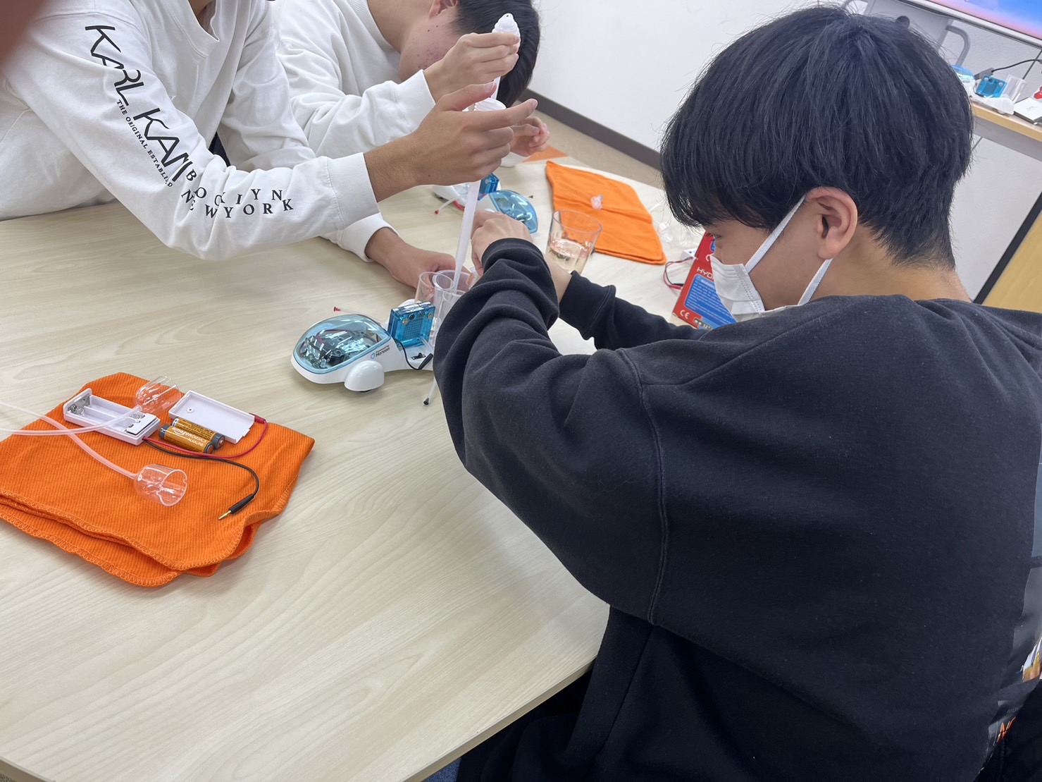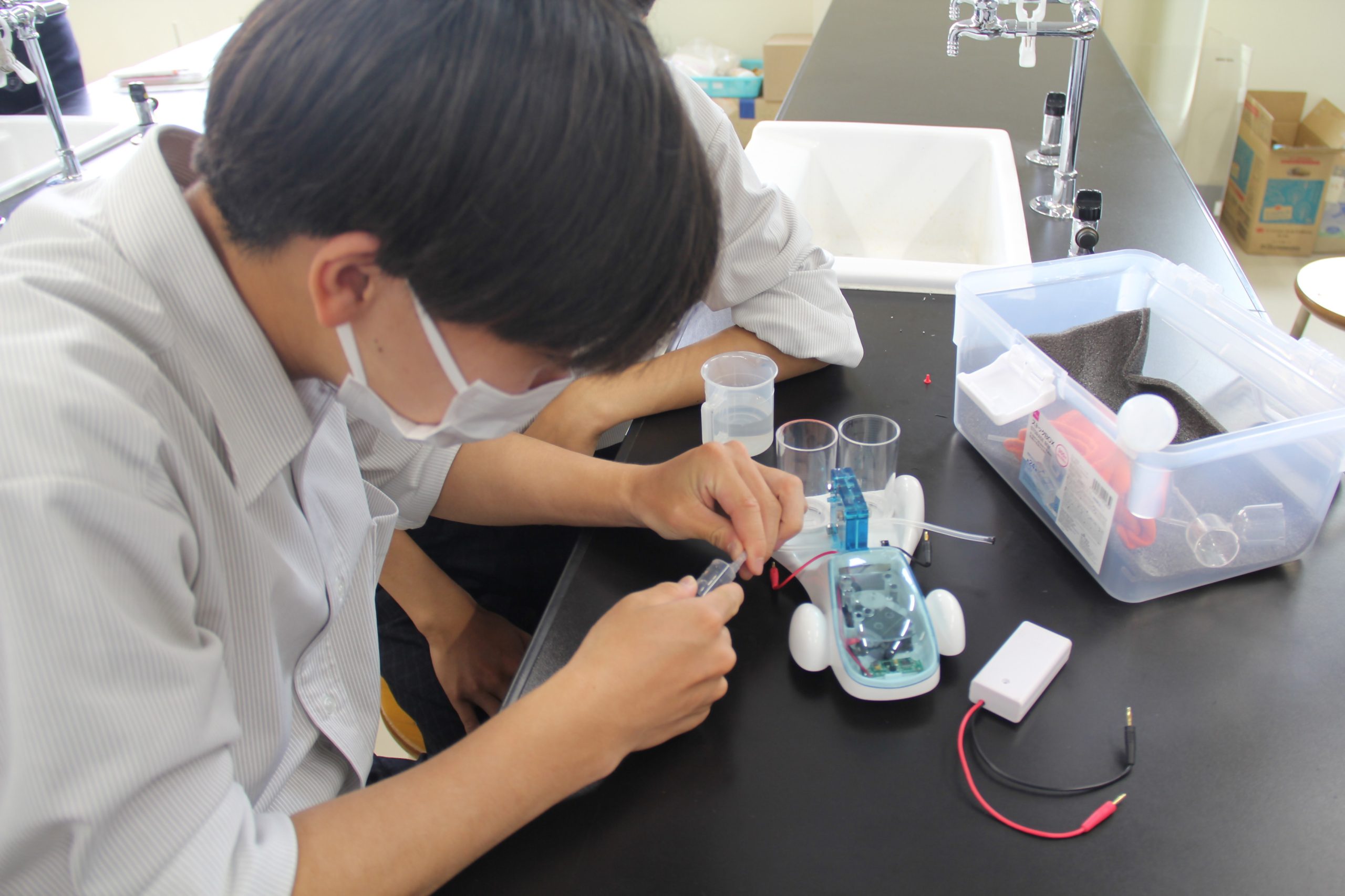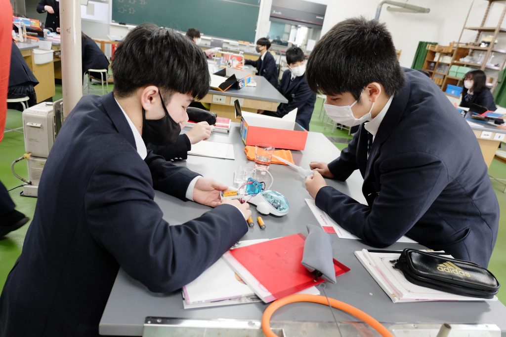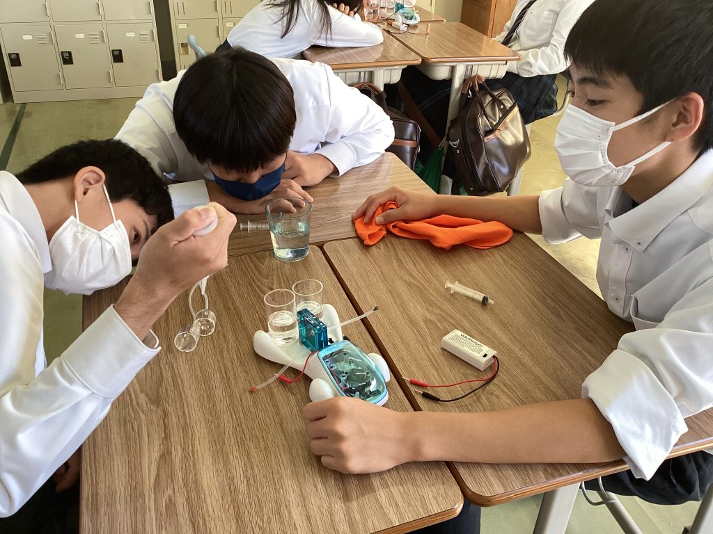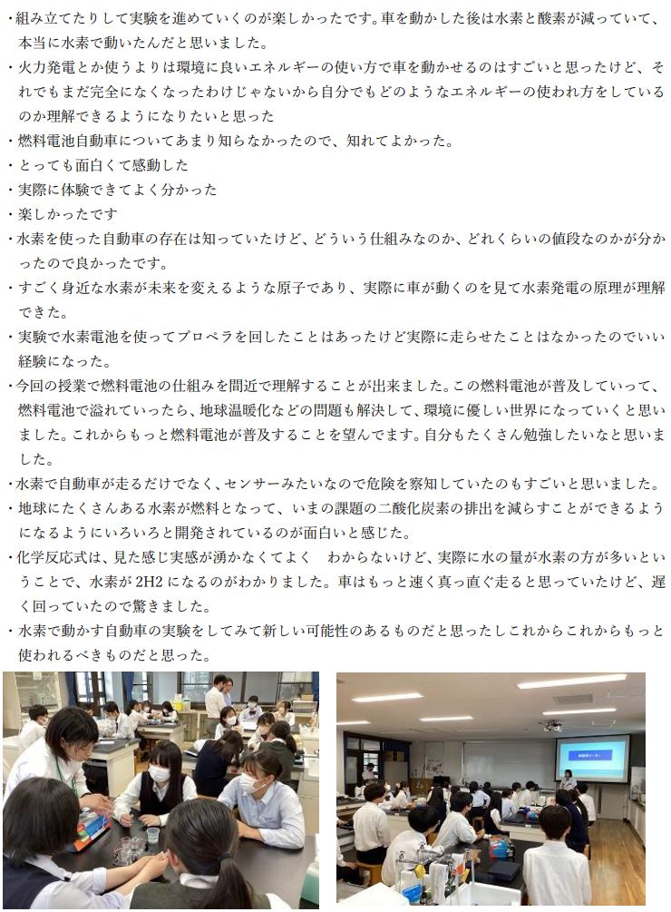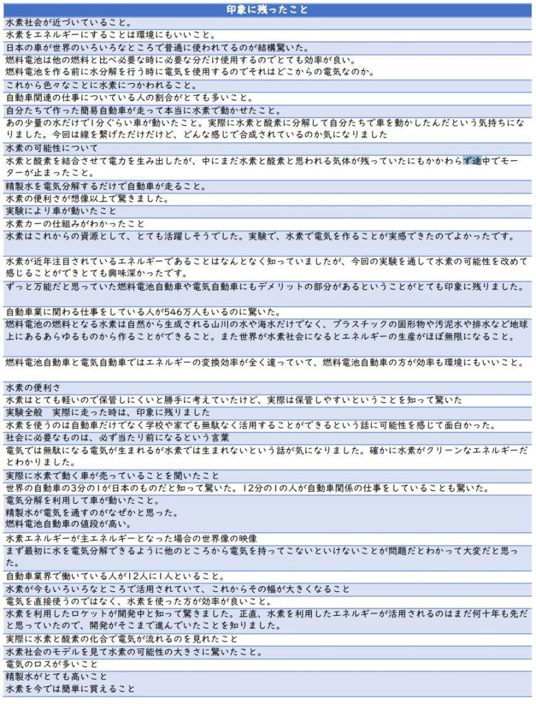「水素という空気中にあるもので走れるというのに驚いたし、環境に優しいエネルギーという一石二鳥で凄いなと思いました。実験は地味な作業だったけど、水素自動車が走った時の達成感があって楽しくでき、水と空気だけで走れるようになる技術は凄いなと思いました。そもそも水素を使うってどうやって思い付いたんだろうとか、様々な疑問が持てて興味も湧いて、楽しく授業を受けることができました。もっと水素自動車が普及していってほしいと思いました。」
