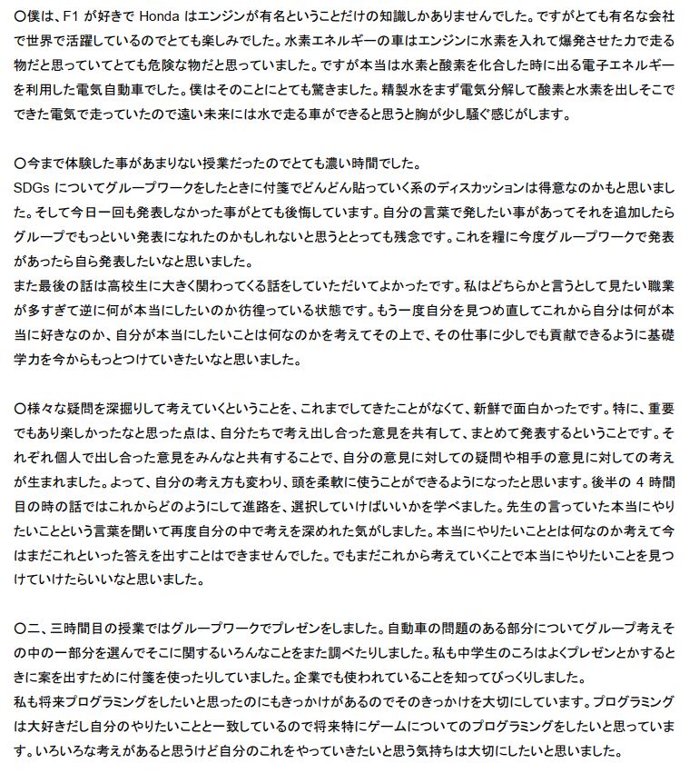 「最初は車に興味はあまりなかったけど、今日の授業を通して今の日本の自動車問題からどう進化していくのか、未来が楽しみになりました。CO2を出さない水素を使った自動車の可能性をこれからも見守っていきたいと思います。また、たくさんの人々が協力して車が動いていることも胸に未来に向けてたくさん学び、興味を持って自分の世界を広げていきたいです。」