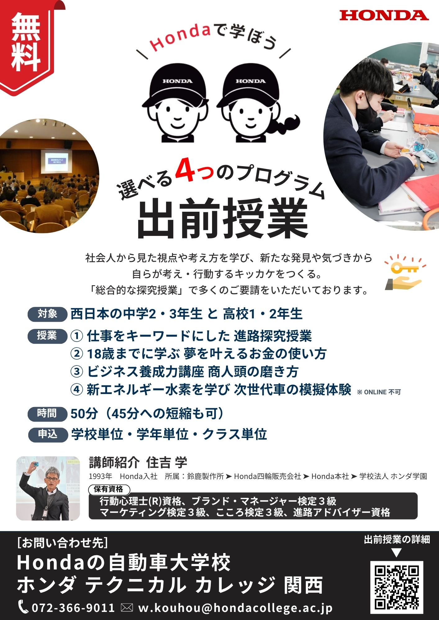 学務室 担当:住吉(スミヨシ) フリーダイヤル: 0120-66-9003 もしくは E-mail:w.kouhou@hondacollege.ac.jp
