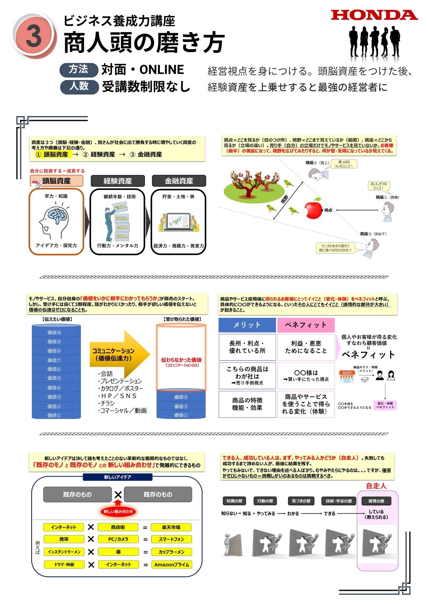 ・18歳で自動車業界へ飛び込み、丸32年のHonda勤務。これまでに自動車の製造/新車のセールス/販売促進・店舗出店候補地リサーチ/エリアマーケティング/自動車販売店の経営改善/システム開発の予算管理/ASIMO(ロボット)のセールスエンジニア/取扱説明書の制作/パンフレット・動画制作/自動車大学校の広報/出前授業の企画・講義/少人数ゼミナール運営 等。