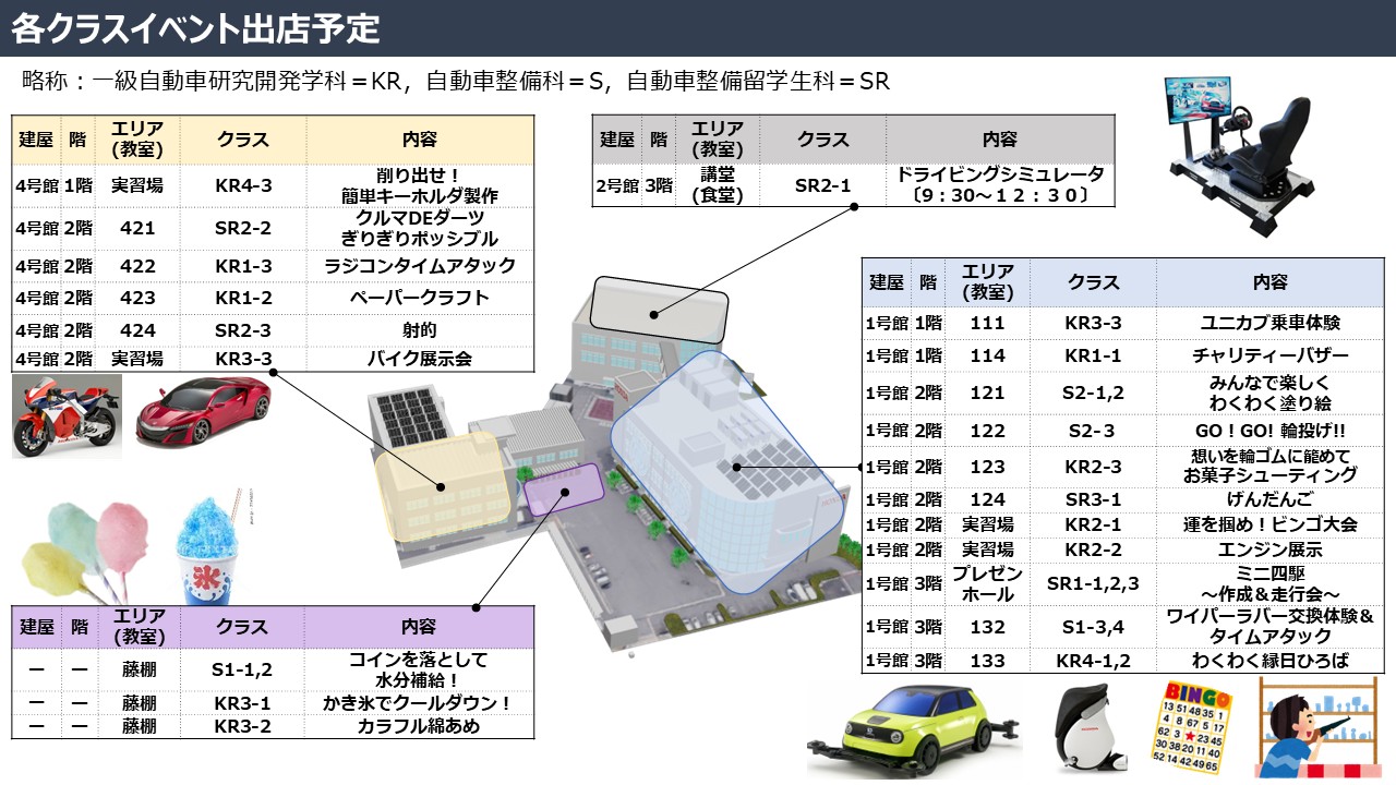 学園生、教職員が一緒になって、地域の皆様・小さなお子様にも楽しんでもらえるイベント内容にしました。当日は、レーシングマシンの展示・エンジン始動やキッチンカーも多数出展しますので、グルメも楽しめます。お友達、ご家族お誘いの上、ぜひ、ご来校ください。