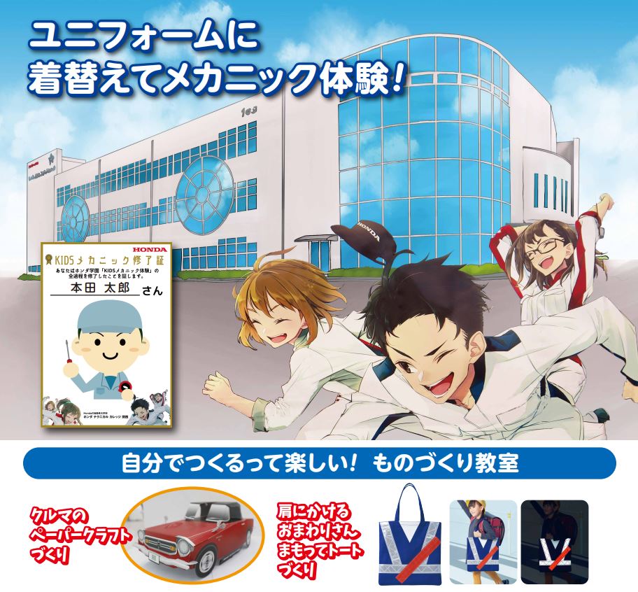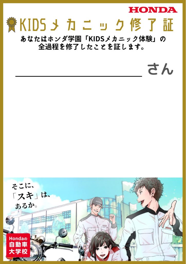 ・参加者の体験授業中の写真・動画撮影を行います。撮影した写真・動画は、ホンダ学園の公式サイト(HP/SNS)やKIDSメカニック体験の募集受付Webサイトに掲載をさせて頂きます。予め、ご理解・ご了承の程よろしくお願いします。