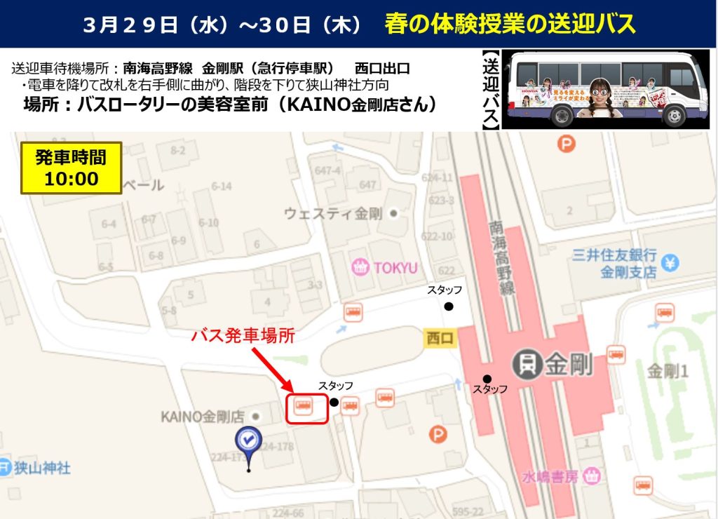■学園の最寄り駅:金剛駅から送迎バス出します。金剛駅は急行停車駅で便利!難波から急行で23分(乗車賃:450円)